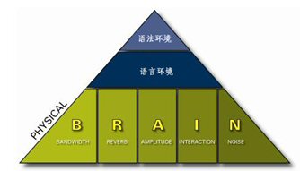 要達到清晰易懂的談話效果需要五個要素的配合:帶寬(Bandwidth)、回響(Reverberation)、振幅(Amplitude)、交互性(Interaction)、噪音水平(Noise)。任何一個會議系統(tǒng)的職責(zé)就是自動調(diào)節(jié)和平衡這五個要素,使進行交談的雙方都盡可能獲得最佳的聽覺享受。在英文里,我們可以用每個單詞的首字母來記憶這五個特征,即:BRAIN模型。