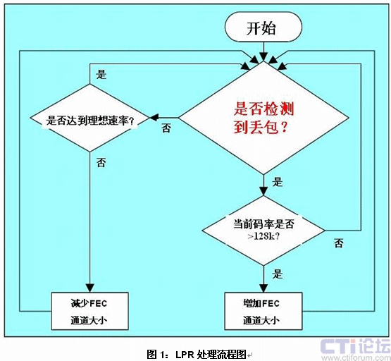 如下面流程圖所示,LPR通過臨時(shí)將一部分通話帶寬分配給一個(gè)數(shù)據(jù)通道(本文中我們將其簡稱為FEC通道),從而用于發(fā)送FEC數(shù)據(jù)給接收系統(tǒng)來發(fā)揮作用。通過一個(gè)循環(huán)處理,LPR會(huì)增加或減少FEC數(shù)據(jù)通道的大小,直到找到必須分配給FEC數(shù)據(jù)通道的最小帶寬,從而使得接收系統(tǒng)能夠恢復(fù)所有丟失的數(shù)據(jù)包。