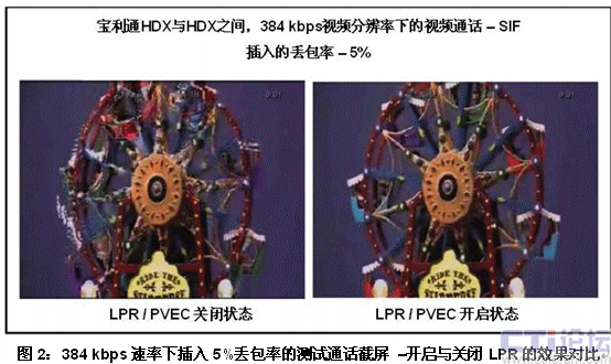 圖2顯示了384 kbps速率視頻通話時(shí),開啟和關(guān)閉LPR功能,5%的丟包率所造成的影響對比。注意左圖中視頻圖像的模糊現(xiàn)象(關(guān)閉LPR / PVEC功能)。右圖中顯示了綜合使用LPR,PVEC和DBA后徹底消除了丟包影響。注意在實(shí)際視頻通話中的圖像失真要比下面左圖靜止圖像所表現(xiàn)的效果還要明顯。