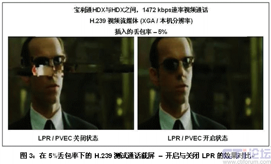 圖3顯示的是對內(nèi)容和演示數(shù)據(jù)進(jìn)行測試的結(jié)果,可以看出LPR對H.239的支持同樣非常出色。開啟和關(guān)閉LPR / PVEC時(shí)對丟包處理的區(qū)別十分明顯。