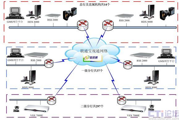 接入層:以視頻終端為主,包括總行、一級分行、總行直屬機構共51臺POLYCOM HDX 8000高清視頻終端,全國二級分行共297個POLYCOM