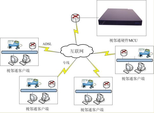 視鄰通系統(tǒng)采用軟硬結合的解決方案思想進行設計,主要組成是一個MCU,依據點數配備軟件終端,軟件終端含一個帶云臺可遠程遙控的攝像頭,以及一個自帶回音消除的全向麥與小音箱。和傳統(tǒng)323產品比較,部署簡單,靈活,在互聯網表現效果良好,并具備強大的數據功能,同時價格更具競爭力,而純軟視頻會議系統(tǒng)相比,則在穩(wěn)定性,清晰度上更勝一籌。