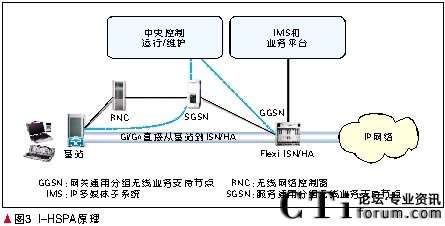 Mb/s為例,一個1 500個扇區(qū)的HSDPA網(wǎng)絡(luò)所產(chǎn)生的數(shù)據(jù)量為21.6 Gb/s。目前業(yè)界RNC的數(shù)據(jù)吞吐量僅達到1 Gb/s。今天各運營商建設(shè)的3G網(wǎng)絡(luò)與2G共用核心網(wǎng),其帶寬和數(shù)據(jù)處理能力遠遠不能滿足HSPA高數(shù)據(jù)率的需求。當(dāng)數(shù)據(jù)負荷激增時運營商將面對RNC/SGSN的擴容的巨大壓力。此外在每一個節(jié)點處對數(shù)據(jù)包的重新拆裝會導(dǎo)致在每一節(jié)點都要引入額外的時延。結(jié)果會產(chǎn)生較長的網(wǎng)絡(luò)時延。對于移動互聯(lián)網(wǎng)應(yīng)用,這種多層次的網(wǎng)絡(luò)結(jié)構(gòu)是沒有必要的。使網(wǎng)絡(luò)扁平化不僅可以簡化設(shè)備降低成本,還可以減少時延。I-HSPA應(yīng)運而生。這種架構(gòu)把基站通過Gi/Gn口直接連接到GGSN節(jié)點(通向互聯(lián)網(wǎng)和數(shù)據(jù)業(yè)務(wù)的網(wǎng)關(guān))[5]。I-HSPA原理如圖3所示。