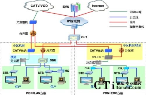 其中,xPON+EoC解決方案專門針對(duì)老小區(qū)或五類線無法入戶小區(qū)。該方案采用頻分復(fù)用技術(shù),可實(shí)現(xiàn)有線電視射頻信號(hào)和以太網(wǎng)IP數(shù)據(jù),在一根同軸電纜內(nèi)同時(shí)傳輸,充分利用已有的同軸電纜資源,混合信號(hào)在客戶端進(jìn)行分離,射頻信號(hào)連接至電視機(jī)或數(shù)字機(jī)頂盒,IP 數(shù)據(jù)信號(hào)連接至電腦,最終實(shí)現(xiàn)HFC雙向化改造及寬帶接入。配合雙向互動(dòng)機(jī)頂盒,廣電能提供交互電視、視頻點(diǎn)播等多種增值業(yè)務(wù)。更重要的是,該方案能夠?qū)崿F(xiàn)xPON設(shè)備和EoC設(shè)備的統(tǒng)一管理,對(duì)設(shè)備、業(yè)務(wù)帶寬及網(wǎng)絡(luò)帶寬進(jìn)行適配與管理,確保業(yè)務(wù)質(zhì)量,做到可管到戶、可控到戶、可控到每個(gè)業(yè)務(wù),大大降低廣電的管理和運(yùn)維成本,提升廣電的服務(wù)能力,為實(shí)現(xiàn)全國有線電視網(wǎng)絡(luò)統(tǒng)一規(guī)劃、統(tǒng)一建設(shè)、統(tǒng)一運(yùn)營、統(tǒng)一管理奠定結(jié)實(shí)的基礎(chǔ)。