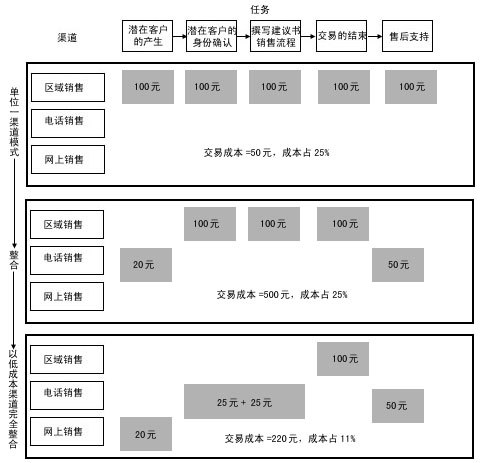 渠道整合強(qiáng)調(diào)在一個(gè)銷售過程中分工的不同給企業(yè)帶來更多的利潤(rùn),將銷售過程的任務(wù)一一分配給不同成本的渠道來完成。銷售過程的中間環(huán)節(jié)——面對(duì)面的銷售和交易的達(dá)成,通常需要由成本較高的區(qū)域銷售代表和分銷伙伴來完成,客戶的產(chǎn)生及身份的確認(rèn)和售后服務(wù)環(huán)節(jié)通常由低成本渠道完成,F(xiàn)在,我們對(duì)照?qǐng)D4來比較一下: