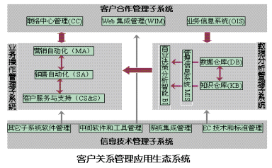 根據(jù)目前IT產(chǎn)業(yè)領域和管理界對CRM的開發(fā)、討論及應用的經(jīng)驗和反饋,綜合來講,一個完整的客戶關系管理應用系統(tǒng)由如下四大生態(tài)子系統(tǒng)組成: