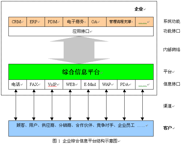企業(yè)綜合信息平臺是一個(gè)完全從客戶出發(fā),并能更好地為客戶服務(wù)的一個(gè)平臺。這里我們所指的“客戶”是一個(gè)廣義的概念,綜合信息平臺的客戶不僅包括企業(yè)的客戶、用戶,而且還包括企業(yè)內(nèi)部的員工、企業(yè)的供應(yīng)商、分銷商及合作伙伴,甚至還包括企業(yè)的競爭對手。綜合信息平臺,保證了企業(yè)內(nèi)部之間、企業(yè)與客戶之間的信息流得到暢通、高效的處理,可以高效、高質(zhì)量地為客戶服務(wù),提高客戶的滿意度和忠誠度,同時(shí)使企業(yè)內(nèi)部的信息實(shí)現(xiàn)共享,并能支撐企業(yè)信息化各環(huán)節(jié)對客戶數(shù)據(jù)的依賴,為企業(yè)信息化建設(shè)提供了一個(gè)開放性的平臺。