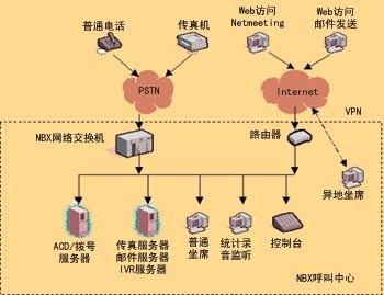 NBX網(wǎng)絡(luò)呼叫中心的核心是3Com公司的NBX網(wǎng)絡(luò)電話交換機(jī),它具有PBX的功能,支持多種外線接入方式,呼入的語(yǔ)音信號(hào)轉(zhuǎn)換為數(shù)據(jù)包,在局域網(wǎng)內(nèi)部傳輸,實(shí)現(xiàn)局域網(wǎng)內(nèi)部語(yǔ)音、數(shù)據(jù)的統(tǒng)一。坐席可以延伸到數(shù)據(jù)網(wǎng)可以達(dá)到的地方(適當(dāng)?shù)膸挘,而不受地理位置的限制。你可以通過(guò)申請(qǐng)各類(lèi)專線,如VPN、DDN等,將計(jì)算機(jī)連入呼叫中心,實(shí)現(xiàn)分地域、分種類(lèi)、分?jǐn)?shù)據(jù)的服務(wù)。NBX網(wǎng)絡(luò)呼叫中心擴(kuò)大了對(duì)外服務(wù)方式,通過(guò)上網(wǎng)訪問(wèn)企業(yè)主頁(yè),并使用Windows集成的Netmeeting軟件通過(guò)使用電腦的聲卡、耳機(jī)、麥克風(fēng)直接與服務(wù)代理人員進(jìn)行語(yǔ)音交流。
