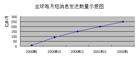 。。2001年全球的短消息服務(wù)業(yè)得到了迅猛的發(fā)展,全球共發(fā)送短消息2000億條。在中國短消息服務(wù)市場中,中國移動在2001年發(fā)送短消息159億條,中國聯(lián)通發(fā)送短消息30億條。隨著中國移動和中國聯(lián)通之間的互聯(lián)互通,中國短消息市場在2002年將達到300億條。并且中國電信和中國網(wǎng)通也加入到此市場中,中國固話短消息也將在此市場中占有一席之地。 中國的移動用戶在2002年4月已經(jīng)到了1.6億戶,并且還在以500萬戶/月的速度發(fā)展,估計到2005年中國的移動用戶將達到4.5億戶,中國手機用戶在35歲以下的占80%左右,他們是使用短消息的主體人群,因此中國移動短消息具有非常大的發(fā)展?jié)摿Α?/p>