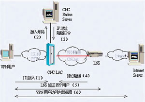 在網(wǎng)通有限公司為中建總公司建設(shè)的網(wǎng)絡(luò)中,當(dāng)用戶撥上網(wǎng)絡(luò)時(shí),網(wǎng)通有限公司的認(rèn)證系統(tǒng)會(huì)根據(jù)帶域名的用戶名確定是哪個(gè)地區(qū)的VPDN用戶,并通過一系列步驟實(shí)現(xiàn)用戶與企業(yè)之間的內(nèi)部通信。