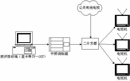 本系統(tǒng)接收端接收實(shí)時(shí)廣播時(shí),除了用普通PC機(jī)收看,或把PC機(jī)接收到的信號(hào)輸?shù)诫娨暎ù笃粒┥鲜湛矗踔吝可以接入有線電視網(wǎng)進(jìn)行播放。具體方法是通過(guò)一個(gè)接收端接收股評(píng)節(jié)目,通過(guò)帶TV-OUT的顯卡把TV信號(hào)輸出到中頻調(diào)制設(shè)備,中頻調(diào)制設(shè)備可以把基帶模擬信號(hào)轉(zhuǎn)換成一個(gè)有線電視信號(hào),且傳輸距離遠(yuǎn),損失小,再把這個(gè)信號(hào)與有線電視信號(hào)一起接入一個(gè)二分支器(2進(jìn)1出),這就可以和公共有線電視共存,形成自己的頻道,供電視接收。