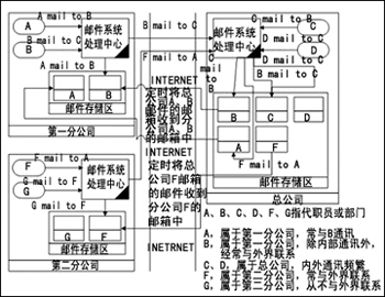 · F mail to A:F發(fā)郵件給A,此郵件經(jīng)由Internet發(fā)到總公司A的信箱中,因為域名是被解釋到總公司的服務器上,第一分公司的服務器會定時將總公司A信箱中的郵件取回,所以對A來講,F(xiàn)發(fā)來的郵件就好像是直接遞送到本公司的服務器上一樣。