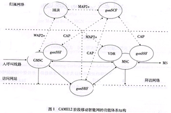 在移動(dòng)通信領(lǐng)域,歐洲電信標(biāo)準(zhǔn)學(xué)會(huì)(ETSI)制定的CAMEL系列標(biāo)準(zhǔn)為基于GSM移動(dòng)通信網(wǎng)絡(luò)的移動(dòng)智能網(wǎng)提供了統(tǒng)一的規(guī)范。其中CAMEL2階段的標(biāo)準(zhǔn)符合ITU-T的IN CS-1,支持各種基于語音的智能業(yè)務(wù)。CAMEL2階段移動(dòng)智能網(wǎng)的功能體系結(jié)構(gòu)如圖1所示。CAMEL3階段的標(biāo)準(zhǔn)基于CS-2,主要增加了對(duì)GPRS移動(dòng)數(shù)據(jù)業(yè)務(wù)以及短消息業(yè)務(wù)的支持。