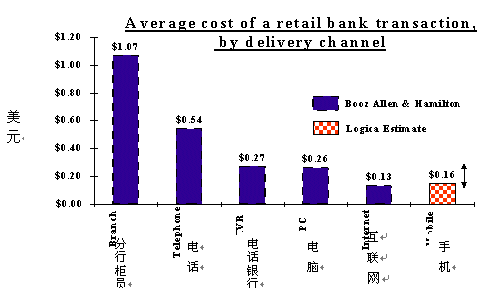 ·降低銀行經(jīng)營成本,提高贏利能力:開展手機銀行服務(wù)可以有效降低銀行經(jīng)營成本。據(jù)國外金融研究機構(gòu)(Booz Allen & Hamilton/Logica Estimate)調(diào)查結(jié)果(如下圖所示)表明:利用手機銀行處理每一筆交易的平均成本為0.16美元,大大降低于1.07美元的傳統(tǒng)柜員交易成本(比柜員成本低85%)。按國內(nèi)目前平均柜臺交易成約為人民幣4元進行推算,使用移動交易的成本為0.6元人民幣。