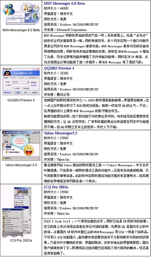 筆者最近試用了上述兩款最新軟件及并對它們及另外兩款著名IM軟件:ICQ和Yahoo Messenger進行了評測。