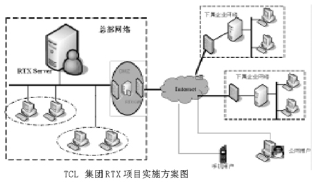 為充分發(fā)揮現(xiàn)有信息基礎(chǔ)設(shè)施和IT應(yīng)用的作用,促進(jìn)企業(yè)的實時商務(wù)運作,節(jié)約開支,集團(tuán)公司在廣泛調(diào)查實時企業(yè)IM軟件的基礎(chǔ)上,于2002年10月對騰訊公司的RTX實時應(yīng)用軟件前身BQQ進(jìn)行了嚴(yán)格的評估和論證,認(rèn)為在如下幾個方面騰訊公司的企業(yè)IM軟件能夠解決TCL集團(tuán)公司面臨的實際問題:①業(yè)務(wù)地點分散,網(wǎng)絡(luò)結(jié)構(gòu)復(fù)雜;②業(yè)務(wù)復(fù)雜,無法形成集中統(tǒng)一的工作流管理系統(tǒng);③人員素質(zhì)差異性較大,復(fù)雜的IT應(yīng)用如OA系統(tǒng)等應(yīng)用推廣受到一定阻力;④集團(tuán)內(nèi)部缺乏一個公共實時交流平臺,企業(yè)內(nèi)部溝通不暢;目前集團(tuán)公司內(nèi)部主要通過電話、傳真和E_mail這些傳統(tǒng)工具傳遞信息,企業(yè)的實時化大受影響。而且騰訊公司的RTX產(chǎn)品投入低,上手快,于是TCL集團(tuán)領(lǐng)導(dǎo)決定上馬RTX項目,自上而下推廣RTX項目。