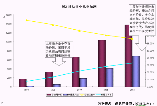 拿移動(dòng)通訊業(yè)務(wù)來(lái)說(shuō),如圖3所示,截至到2002年底,中國(guó)移動(dòng)的市場(chǎng)份額大約在65%,而聯(lián)通為35%左右,網(wǎng)絡(luò)覆蓋以及質(zhì)量也越來(lái)越趨同。從國(guó)內(nèi)國(guó)外的經(jīng)驗(yàn)來(lái)看,移動(dòng)通訊市場(chǎng)的競(jìng)爭(zhēng)正從爭(zhēng)奪市場(chǎng)份額轉(zhuǎn)變?yōu)楸3质袌?chǎng)份額和增加客戶價(jià)值,而主要手段正也從網(wǎng)絡(luò)建設(shè)、營(yíng)銷渠道建設(shè)、價(jià)格戰(zhàn)等轉(zhuǎn)變?yōu)楫a(chǎn)品戰(zhàn)和服務(wù)戰(zhàn)。在這個(gè)階段,兩家主要的運(yùn)營(yíng)公司都對(duì)客戶服務(wù)非常重視。服務(wù)水平的達(dá)標(biāo),投訴流程的梳理,呼叫中心的擴(kuò)大規(guī)模,電話營(yíng)業(yè)廳的建設(shè)等工作是今年的重點(diǎn)。