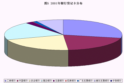 以貸記卡(含信用卡)的發(fā)展舉例:四大國(guó)有銀行在2001年還占據(jù)了絕大部分的份額(圖5是2001年貸記卡的分布)。而從2002的下半年起,深圳發(fā)展銀行、招商銀行陸續(xù)推出了頗具市場(chǎng)競(jìng)爭(zhēng)力的信用卡,廣東發(fā)展銀行等老發(fā)卡行也推出獨(dú)特的女性專用"真情卡"等個(gè)性化產(chǎn)品,對(duì)整個(gè)市場(chǎng)有著很大的沖擊。在信用卡發(fā)卡量迅速提升的情況下,工商銀行2002年貸記卡的數(shù)量比前一年減少了160萬(wàn)張,這也說(shuō)明了市場(chǎng)競(jìng)爭(zhēng)的殘酷。