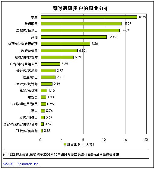從即時(shí)通訊用戶的職業(yè)結(jié)構(gòu)來看,在中國的即時(shí)通訊用戶中,學(xué)生、普通公司職員、工程技術(shù)人員構(gòu)成了最主要的用戶群體,其中學(xué)生的比例最高,達(dá)到了18.24%。看開學(xué)生是中國即時(shí)通訊的生力軍。