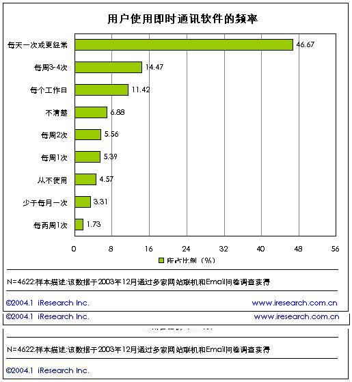 即時(shí)通訊所擁有的實(shí)時(shí)性、跨平臺性、成本低、效率高等諸多優(yōu)勢,使之成為網(wǎng)民們最喜愛的網(wǎng)絡(luò)溝通方式之一。從用戶使用即時(shí)通訊軟件的頻率來看,是比較高的。根據(jù)我們的調(diào)研結(jié)果,58%的用戶至少每天使用一次即時(shí)通訊軟件,使用頻率在每周一次以下的用戶比例僅為15%。