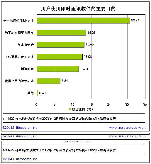 即時(shí)通訊作為網(wǎng)民最常使用的應(yīng)用之一,即時(shí)通訊的多功能性可以滿足用戶的不同需求,達(dá)到不同的目的,根據(jù)艾瑞市場咨詢(iResearch)的研究結(jié)果,在問及用戶使用即時(shí)通訊的目的時(shí),有31%的用戶選擇了“便于與同學(xué)/朋友交流”作為使用即時(shí)通訊軟件的最主要的目的,16%的用戶選擇“為了交到更多的朋友”作為作主要的目的,兩者相加的比例接近了50%。說明與朋友、網(wǎng)友間的交流聊天仍然是即時(shí)通訊軟件的最主要的功能。同時(shí),即時(shí)通訊軟件用戶一般還同時(shí)使用包括文件傳送、語音聊天、郵件檢查、群組聊天、手機(jī)綁定等其他功能。而文件傳輸是其中最主要的一項(xiàng)功能。