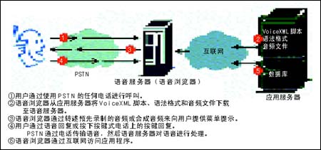 由于電話(包括很多蜂窩電話)沒有計(jì)算功能,無法管理語音瀏覽器,所以語音瀏覽器駐留在網(wǎng)絡(luò)上的語音服務(wù)器中。語音服務(wù)器可以位于企業(yè)數(shù)據(jù)中心,或者位于主管供應(yīng)商處。用戶撥叫一臺語音服務(wù)器,該服務(wù)器從一臺應(yīng)用服務(wù)器上下載VoiceXML 2.0腳本、語法格式和聲音文件。語音瀏覽器以一種語音信息的形式將VoiceXML 2.0腳本翻譯給用戶聽,語音信息可以是預(yù)先錄制的語音,或經(jīng)由一個(gè)文本語音合成器產(chǎn)生的文本。然后語音瀏覽器調(diào)用一個(gè)自動(dòng)語音識別(ASR)軟件,使用語法格式來識別出用戶響應(yīng)的語音詞匯。