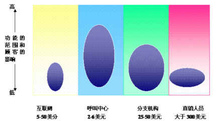 值得注意的是,外呼只是一個手段,它必須和企業(yè)的信息收集、整理、數(shù)據(jù)挖掘、市場策略的制訂等各個環(huán)節(jié)有機(jī)的結(jié)合起來才能發(fā)揮最大的功效。利用呼叫中心的外呼模式進(jìn)行此類業(yè)務(wù)有著其他渠道無法比擬的優(yōu)勢,相對于郵件、信函、分支機(jī)構(gòu)、直銷人員等方式而言對客戶的影響力要大,而成本也相對比較便宜。下圖是著名國際咨詢機(jī)構(gòu)德勤公司對各種渠道與客戶接觸成本的分析: