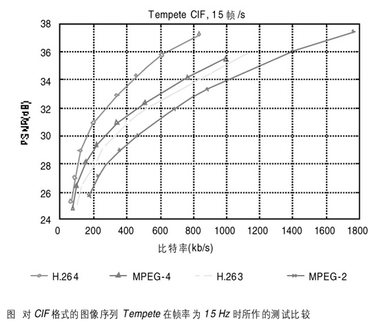 為了闡述H.264的編碼效率,我們將其與其它標準如MPEG-2、H.263、MPEG-4等作比較。使用QCIF、CIF格式的圖像序列作測試,所有編碼器都使用拉格朗日優(yōu)化技術。我們使用H.264的測試軟件JM2.0并使用了Main Profile的主要技術特征。對H.263和H.264采用的參考幀數(shù)為5,只編碼圖像序列的第一幀為I幀,每2個參考幀P之間插入2個非參考幀B。使用全搜索方式進行32×32整數(shù)范圍的運動估計,且由預先設定的量化參數(shù)來進行比特率的調(diào)整。圖為對CIF格式的圖像序列Tempete在幀率為15Hz時所作的測試比較。