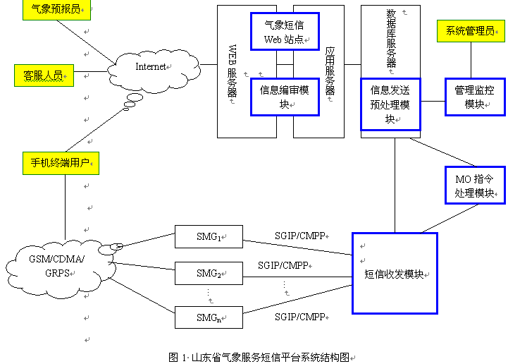 山東省氣象臺為實(shí)現(xiàn)“1210手機(jī)氣象站”服務(wù),通過技術(shù)合作的方式建設(shè)了山東省氣象服務(wù)短信平臺。該平臺采用操作系統(tǒng)無關(guān)、開放性好的J2EE軟件架構(gòu),數(shù)據(jù)庫選用處理能力強(qiáng)、穩(wěn)定性好的Oracle9i大型數(shù)據(jù)庫系統(tǒng),該平臺目前正在為全省50萬用戶每天通過短消息提供各種天氣預(yù)報(bào)服務(wù)。下面將主要介紹氣象短信平臺的系統(tǒng)結(jié)構(gòu)、各模塊功能和系統(tǒng)特點(diǎn)。