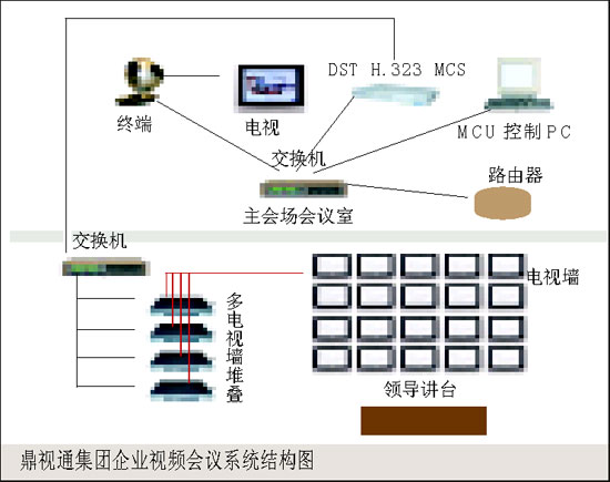 。。為了滿足集團(tuán)總部領(lǐng)導(dǎo)在召開視頻會(huì)議時(shí)能夠同時(shí)看到各分公司和分銷處參與視頻會(huì)議的情況,采用了多臺(tái)鼎視通電視墻服務(wù)器,電視墻服務(wù)器通過與MCU直接進(jìn)行相連將各分會(huì)場的視頻圖像進(jìn)行解碼后重新編碼輸出,從而實(shí)現(xiàn)高質(zhì)量、全體會(huì)場的圖像顯示在電視墻上,接近面對(duì)面的交流感受并且無需特殊管理。
