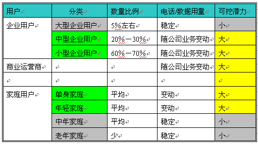 從以上表格可以清楚的顯示中小企業(yè)、商業(yè)運營商、年青用戶對電話和數(shù)據(jù)的使用不穩(wěn)定,這就意味者可發(fā)展、擴大使用的可能性非常大,是企業(yè)增加收入的潛在用戶,但最主要的是如何提高這些用戶的使用呢?經(jīng)濟規(guī)律告訴我們?nèi)绻闾峁┑纳唐穼τ脩粲杏茫瑫r價廉、物美,用戶是不會拒絕的。對于電話運營商來講就是提供給企業(yè)帶來方便、效率、節(jié)省成本、方便管理的服務(wù)的同時,提高有效接通率。