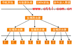 IPTV業(yè)務(wù)提供者可以根據(jù)用戶的請求,利用IP網(wǎng)絡(luò)本身所提供的組播能力將視頻信息以組播的方式傳送給用戶。此時(shí),同時(shí)向相同的業(yè)務(wù)提供者請求發(fā)送相同內(nèi)容信息的用戶,可以由業(yè)務(wù)提供者安排在同一個(gè)組播組中接收到相同的信息。為給內(nèi)容提供者提供知識(shí)產(chǎn)權(quán)保護(hù),業(yè)務(wù)提供者提供條件接入控制。同時(shí)為減少骨干網(wǎng)絡(luò)傳輸?shù)膲毫Γ瑯I(yè)務(wù)提供者在向眾多的用戶提供組播式業(yè)務(wù)時(shí)可以利用多級(jí)組播的形式來實(shí)現(xiàn)。組播式IPTV業(yè)務(wù)可能的系統(tǒng)模型示意如圖1所示。