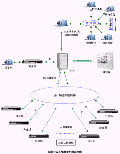 系統(tǒng)在采用E1/G.703接口,每個分會場用一個2M傳輸?shù)那闆r下,單級MCU最多支持96個會場組網(wǎng),兩級MCU最多可達552個會場組網(wǎng)。