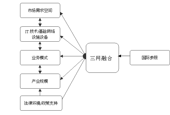 三網(wǎng)融合,需要巨大的市場(chǎng)需求空間、成熟的IT技術(shù)/基礎(chǔ)設(shè)施、適宜的業(yè)務(wù)模式、可觀的產(chǎn)業(yè)規(guī)模以及良好的政策支持和法律環(huán)境等必備條件的出現(xiàn)。