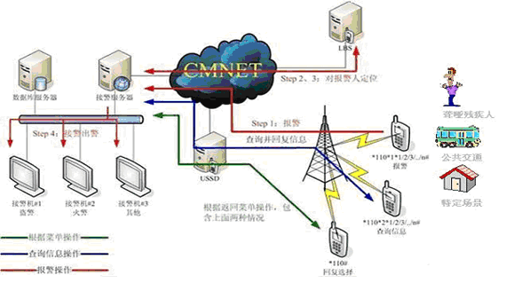 《移動(dòng)定位快信報(bào)警系統(tǒng)》是公眾的報(bào)警短消息是通過(guò)手機(jī)撥打“*110#”,經(jīng)過(guò)USSD移動(dòng)快信平臺(tái)和移動(dòng)位置信息服務(wù)(LBS)平臺(tái),報(bào)警信息數(shù)據(jù)和報(bào)警位置的經(jīng)緯度數(shù)據(jù)信息傳送到110指揮中心系統(tǒng)中,110值班干警通過(guò)網(wǎng)絡(luò)終端,根據(jù)報(bào)警內(nèi)容和報(bào)警人位置信息(電子地圖顯示)等數(shù)據(jù)進(jìn)行處警,特別情況可以直接撥打電話或通過(guò)短信(SMS)交互平臺(tái),進(jìn)一步與報(bào)警當(dāng)事人進(jìn)行短信交互。