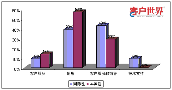 從業(yè)務(wù)功能看來(lái),國(guó)際性呼叫中心和本國(guó)性呼叫中心承擔(dān)著不同的角色。9%的國(guó)際性呼叫中心和14%的本國(guó)性呼叫中心提供僅限于客戶服務(wù),例如賬號(hào)查詢和催費(fèi)收款。39%的國(guó)際性呼叫中心和59%的本國(guó)性呼叫中心專門展開(kāi)網(wǎng)上營(yíng)銷和銷售(外撥為主)。43%的國(guó)際性呼叫中心和29%的本國(guó)性呼叫中心同時(shí)承擔(dān)客戶服務(wù)和銷售功能。最后,我們調(diào)查到9%的國(guó)際性呼叫中心專門從事技術(shù)支持,而且這些中心專門為國(guó)際市場(chǎng)設(shè)立。服務(wù)功能上的差異會(huì)對(duì)商業(yè)定位和人力資源管理提出不同的要求。