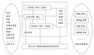 在電信集團(tuán)的統(tǒng)一規(guī)劃下,ISMP和SAG相繼推出。ISMP是綜合增值業(yè)務(wù)管理平臺(tái),ISMP不但可以解決現(xiàn)網(wǎng)固網(wǎng)/PHS業(yè)務(wù)管理的問(wèn)題,而且可以配合促進(jìn)3G業(yè)務(wù)試驗(yàn)和體驗(yàn),不斷完善,進(jìn)行增值業(yè)務(wù)價(jià)值鏈、業(yè)務(wù)內(nèi)容合作,收集市場(chǎng)需求和完善的增值業(yè)務(wù)應(yīng)用模式,整合和強(qiáng)化現(xiàn)有的市場(chǎng)營(yíng)銷(xiāo)環(huán)節(jié)。SAG是業(yè)務(wù)接入網(wǎng)關(guān),它包含與業(yè)務(wù)引擎的“業(yè)務(wù)能力驅(qū)動(dòng)”接口,包含與ISMP的“SP/用戶(hù)管理”接口,包含對(duì)移動(dòng)和固定網(wǎng)絡(luò)的支持。ISMP、SAG與業(yè)務(wù)平臺(tái)和周邊支撐系統(tǒng)的關(guān)系如圖7所示。