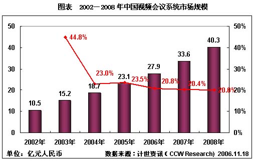 在2003年的井噴式發(fā)展之后,視頻會議系統(tǒng)市場發(fā)展速度開始進(jìn)入低速發(fā)展階段,市場逐漸出現(xiàn)飽和的趨勢。計(jì)世資訊(CCW Research)最新視頻會議報(bào)告數(shù)據(jù)顯示,從2003年非典時期視頻會議市場井噴式發(fā)展之后,2006年視頻會議系統(tǒng)的增長率開始下降,如何開發(fā)新的產(chǎn)品,成為視頻會議系統(tǒng)市場繼續(xù)發(fā)展的關(guān)鍵。而3G商用的到來,由此產(chǎn)生的移動視頻業(yè)務(wù)也必將成為未來移動通信新的市場增長點(diǎn),可以說,移動信息化建設(shè)將為視頻會議系統(tǒng)開拓一片新的藍(lán)海。