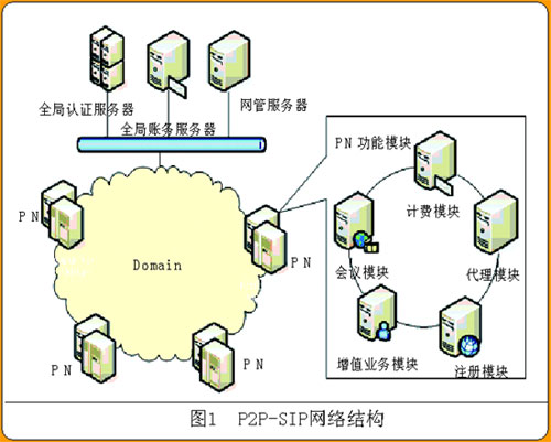 PN在地理上散布各處,邏輯上根據(jù)選用的P2P機(jī)制的不同可以是環(huán)形的(Chord協(xié)議)、矩陣的(CAN協(xié)議)、網(wǎng)狀的(Pastry協(xié)議和Tapestry協(xié)議);镜腜N至少包括注冊(cè)和代理兩種功能。為進(jìn)行商業(yè)運(yùn)營(yíng),可以部署全局認(rèn)證服務(wù)器、全局賬務(wù)服務(wù)器和網(wǎng)管服務(wù)器等等,用于管理全部的用戶和所有的PN。