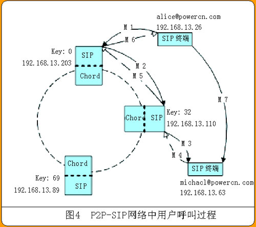 IP地址為192.168.13.26的用戶alice@powercn.com要呼叫用戶michael@powercn.com。alice可以把請(qǐng)求發(fā)給P2P-SIP網(wǎng)絡(luò)中任一PN。考慮到要在P2P-SIP網(wǎng)絡(luò)上提供增值業(yè)務(wù)(比如計(jì)費(fèi)),alice把INVITE請(qǐng)求發(fā)給管理它的PN更合適一點(diǎn),在本例中是IP為192.168.13.203,Key值為0的PN。如圖4中M1所示。