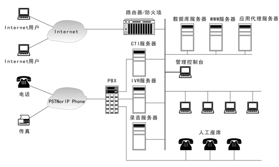 現(xiàn)有的電信網(wǎng)絡中,都是基于交換方式或基于語音板卡方式,該篇所述是基于PBX交換方式,即用戶打入PBX的電話,可以通過CT-LINK、CT-Connect等接口,以局域網(wǎng)方式轉(zhuǎn)到有關(guān)的計算機平臺,獲得流程處理信息,提供電信業(yè)務。簡單原理圖如下所示: