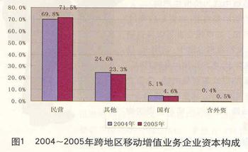 電信增值市場的開放和政策環(huán)境的優(yōu)化,也吸引了眾多的外資企業(yè)。電信增值服務(wù)的投資來源、經(jīng)營主體、服務(wù)目標(biāo)、經(jīng)濟(jì)功能與基礎(chǔ)電信業(yè)務(wù)存在明顯差異,彼此間有競爭關(guān)系,但更多的是補充、豐富的關(guān)系。目前,我國已放開電信增值市場準(zhǔn)入,從2005年起,整個電信增值業(yè)務(wù)市場就呈現(xiàn)出持續(xù)快速發(fā)展的勢頭,民營資本已經(jīng)發(fā)展成為電信增值業(yè)務(wù)領(lǐng)域的主力軍,其所占企業(yè)數(shù)量比例已超過70%(見圖1)。