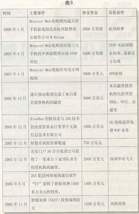 近幾年來,一些資本投資商將投資的重點放到了無線音樂、手機游戲和手機視訊等業(yè)務(wù)領(lǐng)域,逐步加大了對SP的投資力度(見表3)。進(jìn)入2005年以來,著眼于2.5G向3G的全面演進(jìn),風(fēng)險投資對SP的投資力度進(jìn)一步加大。以滾石移動為例,在2002年和2004年獲得兩輪風(fēng)險投資之后,滾石移動憑借在無線音樂領(lǐng)域取得的良好市場業(yè)績,又獲得了智基創(chuàng)投、華登國際、聯(lián)想投資等公司的投資,投資金額達(dá)3000萬美元。繼2004年10月獲得IDG投資以后,2005年12月7日,國內(nèi)著名的數(shù)字音樂門戶——A8音樂集團(tuán)獲得了包括IDG和Intel投資公司在內(nèi)的5家國際著名投資機構(gòu)的投資,投資金額達(dá)2000萬美元。同月,掌中無限則獲得了來自全球性風(fēng)險投資商BlueRun創(chuàng)投基金和IDG總額達(dá)上千萬美元的投資。