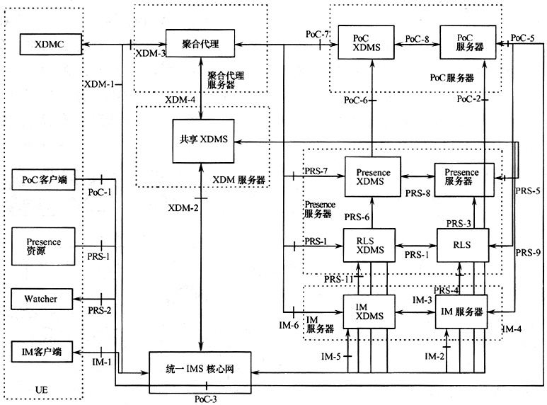 OMA雖然定義了XDM、Presence(呈現(xiàn))、Instant Message和PoC等業(yè)務的功能實體和參考點,但是為了在網絡中實現(xiàn)以上業(yè)務,需要將OMA定義的功能實體和參考點映射成物理實體和協(xié)議,確定運營商開放此類業(yè)務對設備和協(xié)議的要求,圖2給出了一種映射的方式。XDM服務器包含的共享XDMS功能提供公共群組的能力,有利于用戶在使用PoC、IM等業(yè)務時也能共享此群組。