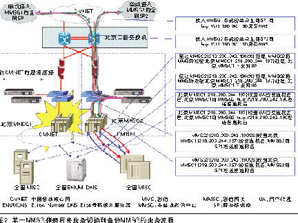 為驗證基于IP尋址的彩信網關備份方案的現網可行性,2006年12月6日在北京MMSG進行了容災備份的測試。當時,北京MMSG1已經割接入網,承載空中網公司、Sina公司的業(yè)務,北京MMSG2正在進行測試,TOM公司進行配合。