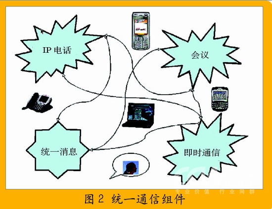 通信的終端可能是桌面電話、計(jì)算機(jī)、手機(jī)或者PDA。這4個(gè)部分之間存在緊密的聯(lián)系,比如說電話語(yǔ)音可以轉(zhuǎn)換為統(tǒng)一消息;電話不可達(dá)時(shí),可以采用即時(shí)消息溝通或者小組成員可以使用多種方式參與到同一個(gè)會(huì)議中來等等。而所有這些聯(lián)系可能建立在統(tǒng)一的平臺(tái)之上: