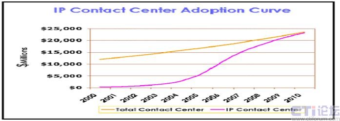 支持多渠道上的聯(lián)系以及降低集中網(wǎng)絡(luò)和標準硬件的成本的需求構(gòu)成了IP技術(shù)的主要推動力。正如當前通訊網(wǎng)絡(luò)領(lǐng)域內(nèi)正在進行的從回路到IP的技術(shù)轉(zhuǎn)移一樣,在聯(lián)系中心技術(shù)的領(lǐng)域也有相應(yīng)的轉(zhuǎn)移。下圖描述了這一轉(zhuǎn)移,根據(jù)現(xiàn)有數(shù)據(jù)外推并預(yù)測了直至2010年世界范圍內(nèi)投資于聯(lián)系中心IP技術(shù)的金額以及所占整個聯(lián)系中心投資的比例。