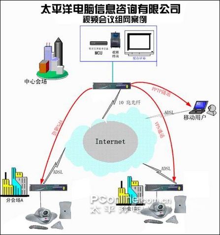 該方案有很強(qiáng)的針對(duì)性,作為主會(huì)場(chǎng)必須用10兆/20兆光纖接入INTERNET,且需要視頻交換處理設(shè)備MCU,而太平洋電腦網(wǎng)本身就具備雄厚的服務(wù)器作為基礎(chǔ)。廣州總公司還需要較高配置的視頻終端設(shè)備,在局域網(wǎng)網(wǎng)關(guān)上安裝較高配置路由器,主會(huì)場(chǎng)可以通過(guò)設(shè)置MCU隨時(shí)使某一分會(huì)場(chǎng)成為主席。