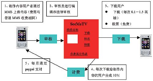 這種模式是UGC最具魅力之處。在互聯(lián)網(wǎng)上,UGC的內容大多是免費提供和分享的,而在移動網(wǎng)絡上,制作內容的用戶可以賺錢。移動運營商可以向下載這些內容的用戶收費,所獲得的收入將在移動運營商、內容提供者以及平臺提供商(如MySpace)之間進行分成,如“3”公司的視頻共享業(yè)務SeemeTV(見圖2)的收費和分成模式。