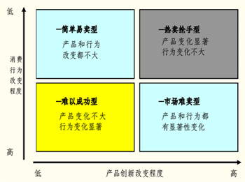 一般來說,產(chǎn)品創(chuàng)新程度越大,取得突破性的成就就越大,但這往往需要消費者改變消費行為和習慣。消費行為的改變是一個漸進的過程。對于企業(yè)來說,開發(fā)一個對客戶有價值的創(chuàng)新產(chǎn)品,要想獲得成功,必須盡量減少消費者行為的改變。我們以消費行為改變程度和產(chǎn)品創(chuàng)新改變程度兩方面進行組合得到一個矩陣: